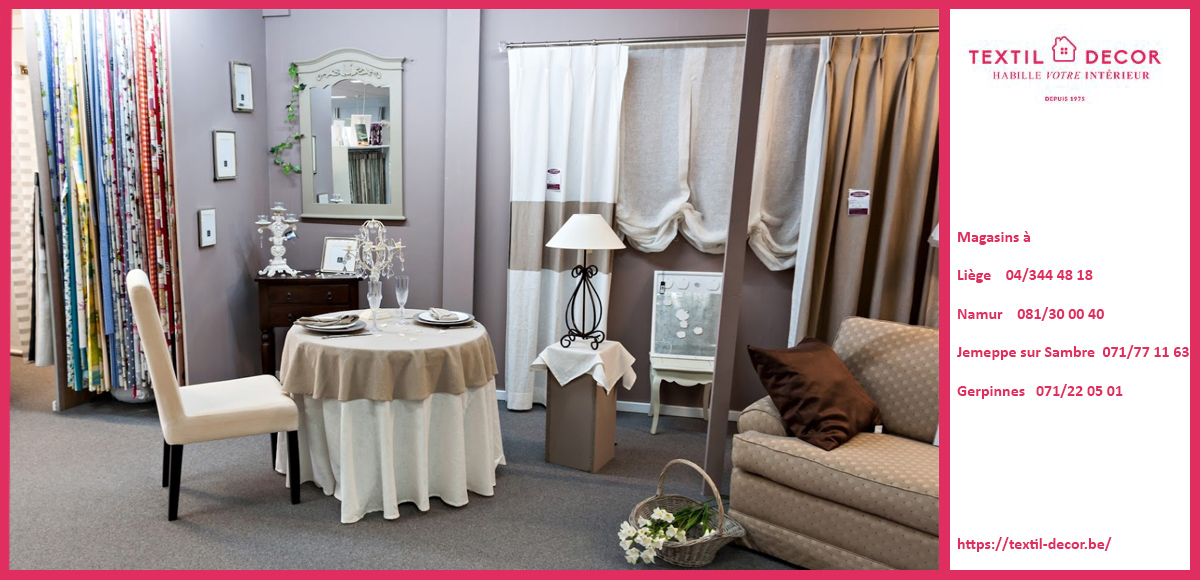 Rendez-vous dans nos magasins Textil Décor pour découvrir nos collections de tissus d’ameublement et bénéficiez d’un accompagnement personnalisé pour concrétiser vos envies déco. Nous sommes présents à Liège 04/344 48 18, à Namur 081/30 00 40, à Jemeppe-Sur-Sambre 071/77 11 63 et à Gerpinnes 071/22 05 01. Consultez notre site pour connaître nos adresses et nos heures d’ouverture.